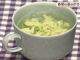 材料・作り方(2人分) ① 春菊の茎約50gは小口切りにする。 ② 鍋にささ身のゆで汁全量(約2カップ)を入れて煮立ててアクを除き、塩小さじ1/3、(1)を加えてひと煮立ちさせる。 ③ 卵1個を溶いて流し入れ、再び煮立ったら火を止める。 あえものに使ったささ身のゆで汁と、とりおいた春菊の茎を合わせてスープを作ります。卵をプラスしたシンプルな塩味のかき玉スープがおすすめ。