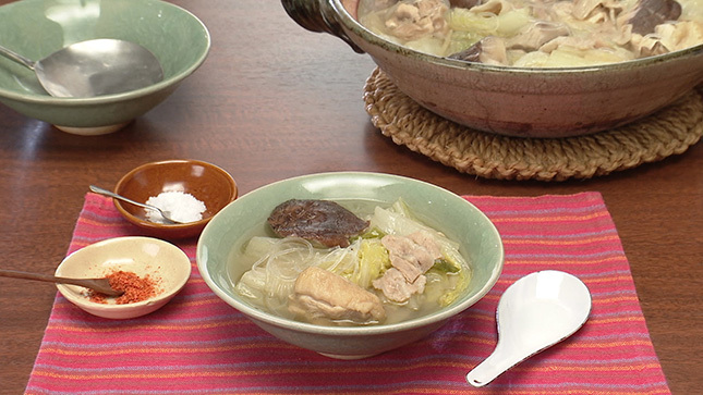 干し椎茸のもどし汁で煮るのが特徴の鍋です。干し椎茸は水に浸し、冷蔵庫で一晩おいてもどしましょう