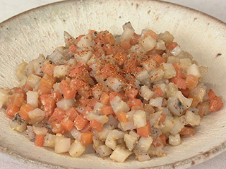 材料・作り方(作りやすい分量) ① れんこん100g、にんじん1/2本(70g)は5㎜角に切る。 ② フライパンに油小さじ1を熱し、(1)を2分ほど炒める。とりおいたみそ床全量(約40g)、水大さじ4を加え、汁気がなくなるまで炒める。好みで七味唐辛子をふる。 「牛肉のみそ漬け焼き」でとりおいたみそ床は、加熱調味料として利用できます。残った根菜を炒めておけば、混ぜごはんの具材などにも使えます。