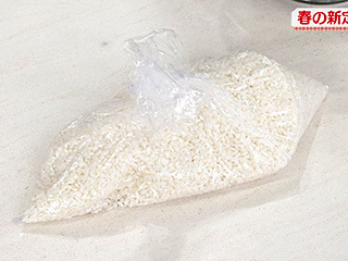 米は洗い、ザルに広げて水気をきり、そのまま30分ほどおく。水を吸った「洗い米」を再び計量し、同じ量の水を加えて炊飯器の早炊きモードで炊く。すぐに炊かない場合は、洗い米をポリ袋に入れる。冷蔵で1~2日保存可能。翌日すぐに炊くことができる。
