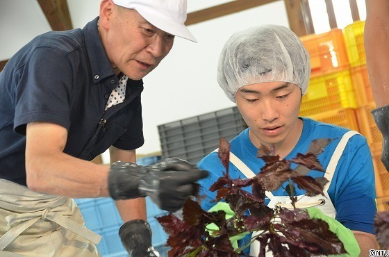 赤シソを洗い、一つ一つ手作業で葉をとっていく。