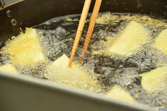 水なすの中身をくり抜き、ひき肉をつめて揚げるという料理。