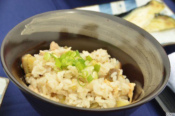 炊き込みごはんに水なすを入れるというとても面白い料理。