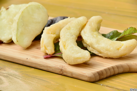 5. 野菜に衣を付けて、170℃の油で揚げて完成。塩を付けていただく
