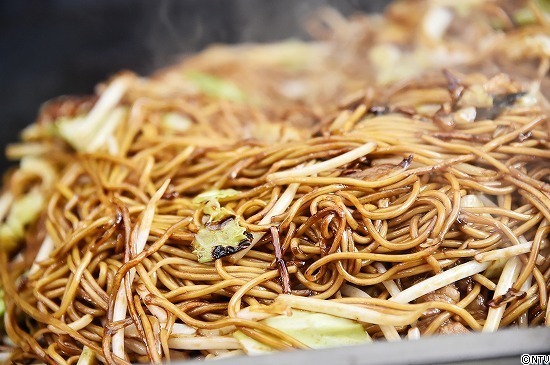③麺を鉄板に広げ、焼いた肉、キャベツを上に麺の上に乗せながら焼き目をつける。