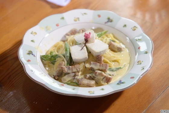 5)ゆでたてのスパゲッティーとアスパラを入れ、ゆで汁と残りの牛乳、さくらチーズの2/3量、