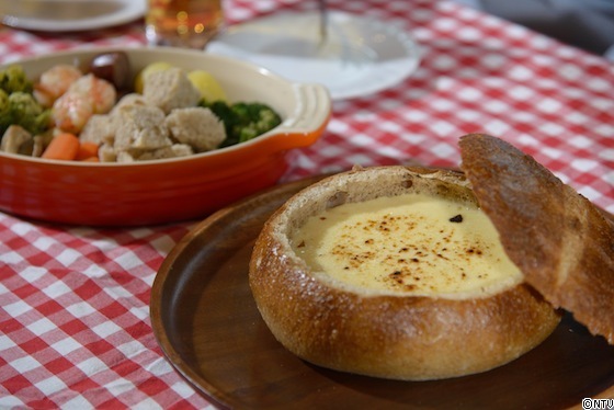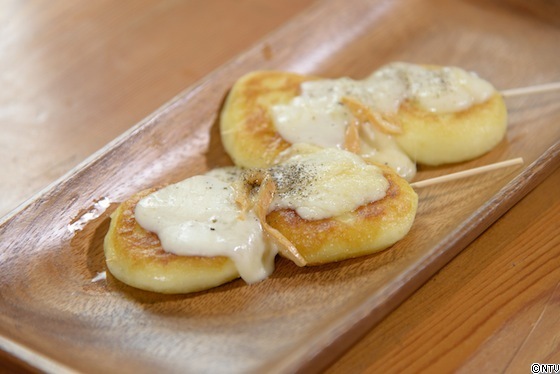 4) 熱々の団子を串にさして、とかしたラクレットをとろりとかけて完成!