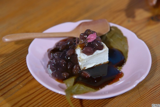 1)さくらチーズを切り、ゆで小豆を添えて黒蜜をかける。