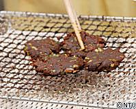 2、 薄く片栗粉をまぶし、170℃の油で揚げる