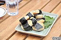 ⑧ 一口の大きさに取り、ワンタンの皮をまぶし蒸篭で7〜8分蒸す