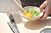 5 卵3個を軽くほぐし、炒めた具と蟹、ホタテの半量を入れて混ぜる(1人前ずつ作る)