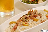 器にガーリックライスを盛り、タコトマトソースをかけ、フレッシュバジルを飾って完成。