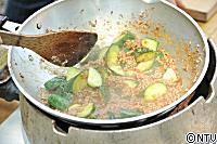 ①豚挽肉を炒め、乱切りにしたきゅうりを入れる。