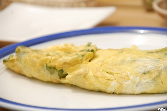 ③ しょうゆ、顆粒だしで味付けし、最後に溶き卵を入れ、オムレツ型にする