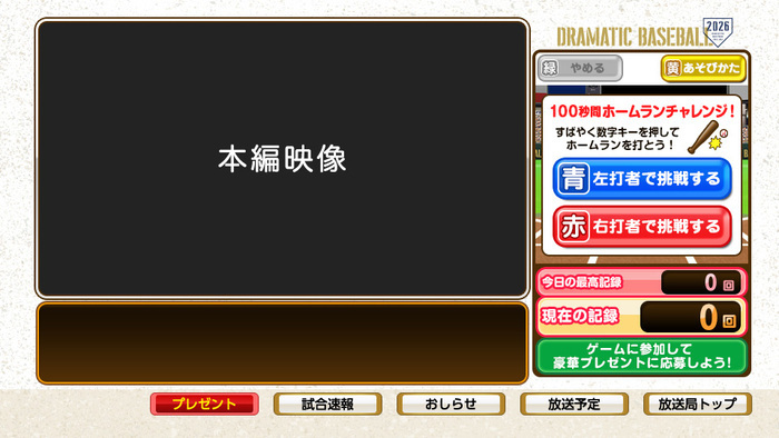 - ホームランの直後にテレビの電源をオフにしたり他のチャンネルを選局した場合、プレゼントキーワードが表示されない場合があります。