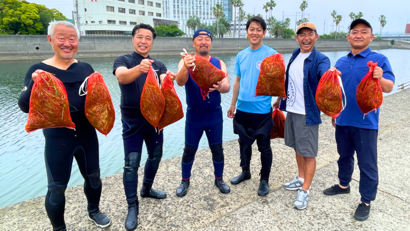 鹿児島県内有数のアマモの生息地である 与次郎ヶ浜長水路に潜り アマモの種を採取。