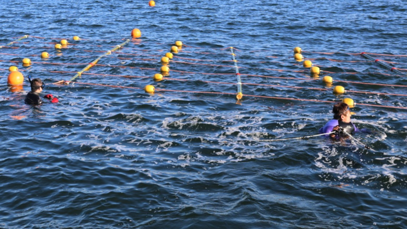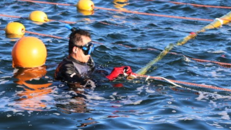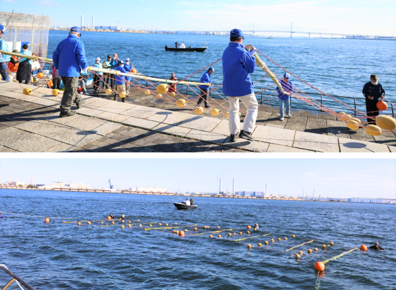 最後に、海中に設置した筏に、ダイバーが 種糸ロープを取り付け、イベントは終了!