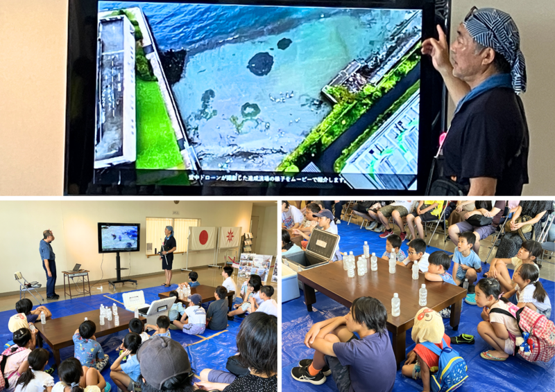 「浅瀬の藻場のドローン撮影映像紹介」も行われ、子どもたちは 興味津々に聞き入っていました。