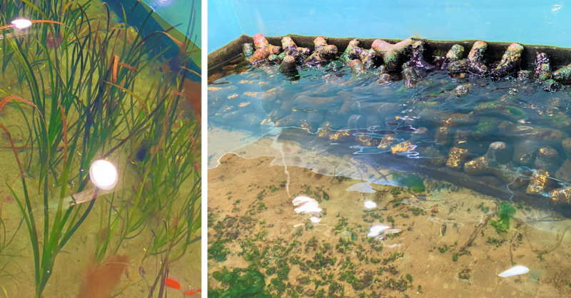 シーラボの一角には、巨大な水槽が鎮座しており、水槽内を見てみると アマモが揺れ、