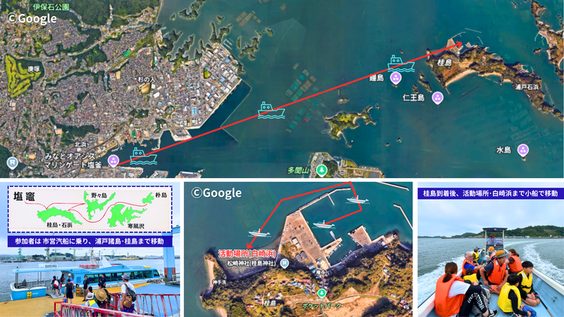 桂島の桟橋まで移動。次に小船に乗り換え 活動場所である桂島 白崎浜へ向かいます。