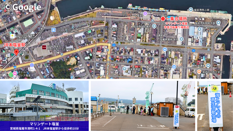 ◎集合場所:「マリンゲート塩釜」船乗り場 ※市営汽船乗り場周辺に「アマモ」のノボリ、看板が目印