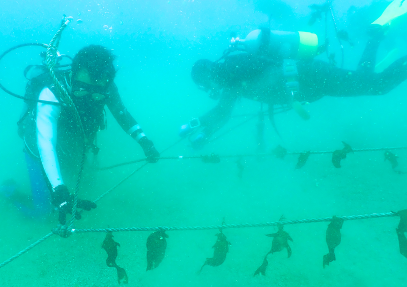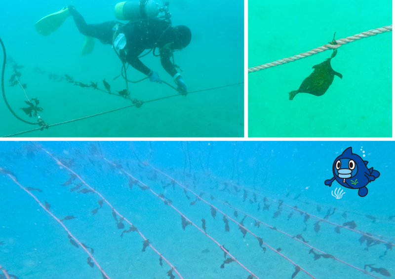 その後、藻場造成メンバーは 海に潜り、県水産技術センターが陸上水槽で育成した早熟性カジメの苗を