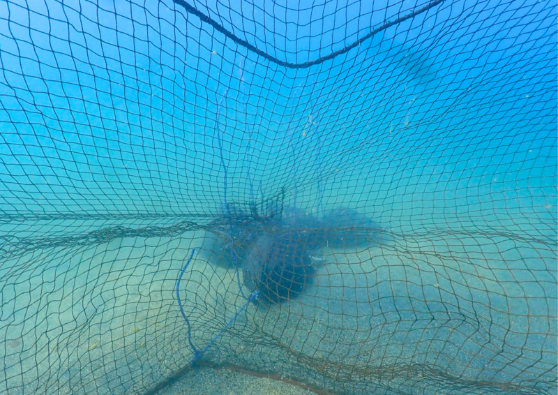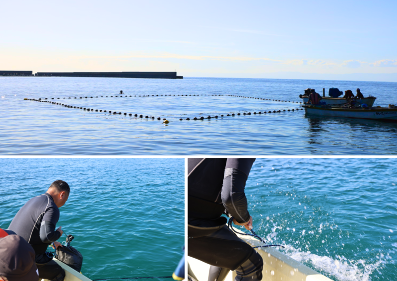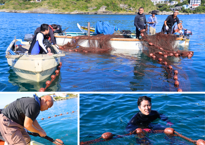 続いて、船は カジメ場造成場となる地点へ移動。食害などを防ぐ 防護ネット(20m×20m四方)を張り