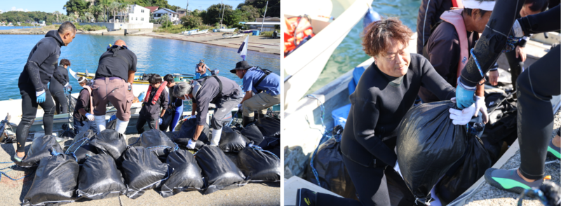 まずは、諸磯港で、防護ネットと土嚢を積み込むことに。この土嚢には、日本製鉄よりご提供いただいた