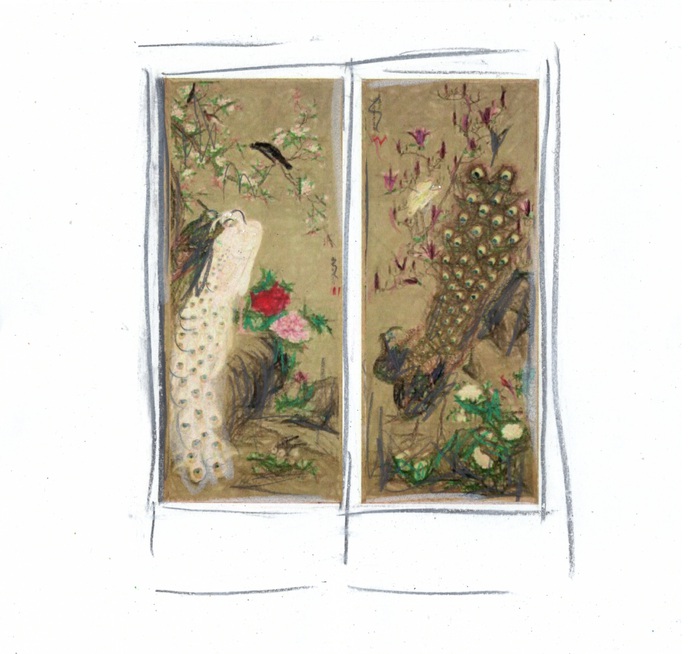 活動は絵画のみならず本もたくさん執筆し、現代のマルチアーティストのようだ。囲碁について書いた『観奕記』や、書画について書いた『松秀園書談』、煎茶について書いた『煎茶式』などの著作も残している。なんと多趣味な人だろう。政治家としてではなく、文人として非常に広範囲に関心を広げた人であったことがよくわかる。今回の修復を終えて、初来日するのは、吉祥モチーフを濃密な彩色で精緻に描いた「孔雀図」だ。これもやはり南蘋風のきらびやかな花鳥画だ。左幅は、白孔雀。背景には、「かいどう」と「ぼたん」の花。この花の組み合わせは人々が富み栄えることを意味する「満堂富貴」(まんどうふうき)という画題。右幅は、孔雀の背後に、木蓮、笹やバラなどの草花が咲き誇り、同じくおめでたいテーマを描いている。