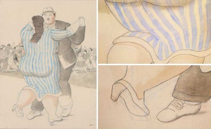 油絵では特に赤(ピンク)と緑を多用するボテロさんですが、今回の水彩画シリーズではどの作品にも少しずつ「青」が入っているのが特徴。ボテロさんが幾度となく描いてきた、カーニヴァルや闘牛、ダンス、カップルといった定番のモチーフが、水彩画として生まれ変わりました。