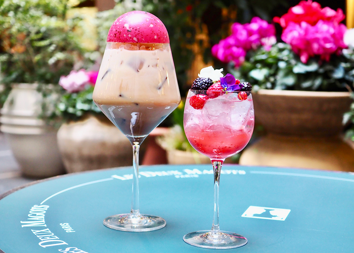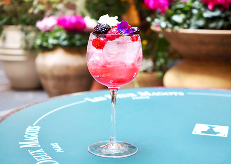 たっぷりのラズベリーを使用した自家製ラズベリーシロップにソーダを加えて、さっぱりとした大人な味わいに仕上げたフルーツエイド。ボテロの作品 《赤の花》 をイメージして、様々なベリーとお花をのせました。初夏にぴったりのさわやかなドリンクです。