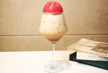 自家製マサラチャイシロップと北海道ミルクを使用したボリューム感のあるアイスチャイフロート。グラスにもこだわり豊満さを強調しました。バニラビーンズアイスの上には半球ドームのチョコをのせて、ボテロの作品《コロンビアの聖母》に描かれた王冠をイメージ。味も見た目も楽しめる一品です。