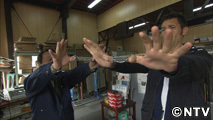 ジローラモさんは社長考案の、バネを使った健康器具を体験。