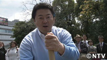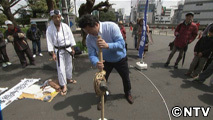上野公園で必死に棒を立てようとしている舞の海さん。