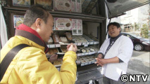 路上で“チョコとうふ”と書かれたのぼりを掲げた路上販売車を見つけます。