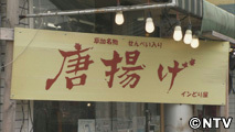 『せんべい入り 唐揚げ』の看板を発見した石丸さん。