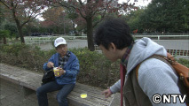 続いては桶川駅で途中下車。公園の中でカップ麺を食べている人を発見します。しかしよく見ると、手にはマグカップの様なものが・・・。
