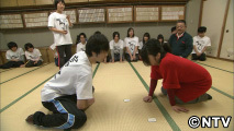主将に挑戦するもあまりの速さに驚きの連続。目隠しのハンデをもらって再挑戦した夏川さんはやっとの思いで一枚ゲット。たった一枚、されど一枚!札が取れて大喜びです!