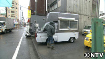 駅前で外車のような変わった形の車を発見!持ち主の竹内さんに伺うと、移動販売車でした。他の移動販売車もあるということで、会社へ連れて行ってもらうことに。その中で一番目をひいたのが移動式ヘリコプターのシミュレーターカー。