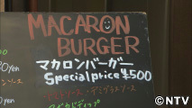 路地に逃げ込んで見かけた「マカロンバーガー」と書かれた看板。