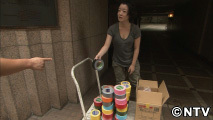 とあるマンションの前で、色とりどりのガムテープを積み上げている人が。