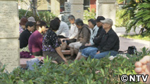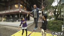 お寺の前を通りかかると、綱渡りのような事をしている人達を発見。