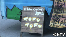 そんな風景を横目に歩いていると移動販売車がたくさん止まっている場所を発見。近づいて行くと一台の移動販売車に「とうふバーガー」と書かれたのぼりが。