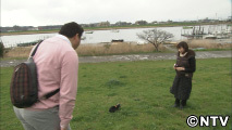 江戸川の土手で、ウサギを散歩させる女性を見つけた舞の海さん。