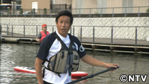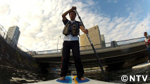 サップ(スタンドアップパドルボート)に乗って、早朝の水上散歩です。
