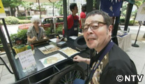 今回は新しくなった豊島区役所で待ち合わせ。区役所前の通りでは土日限定でマーケットが開かれており、なぎらさんはイケブクロだけに、「フクロウ」になれる似顔絵に挑戦しました。