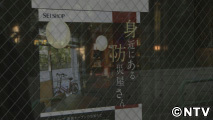 一軒の店前に、身近な防災屋さんと書かれた張り紙が…。