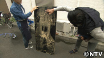一軒の住宅前で、木版画に使用する版木を洗っていた湯浅さん。