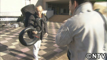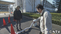キャンパスを正門から眺めていると、工事用の三角コーンに、銀色のダクトのようなものをつなごうとしている人を発見!