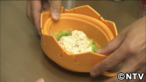 容器に食材を入れ、レンジで加熱調理できるレンジクッカーは、ギザギザの切れ目が適度に蒸気を逃がし、持ち手がついているので、やけどもせず、そのまま折りたためば食器にもなるアイデア商品です。